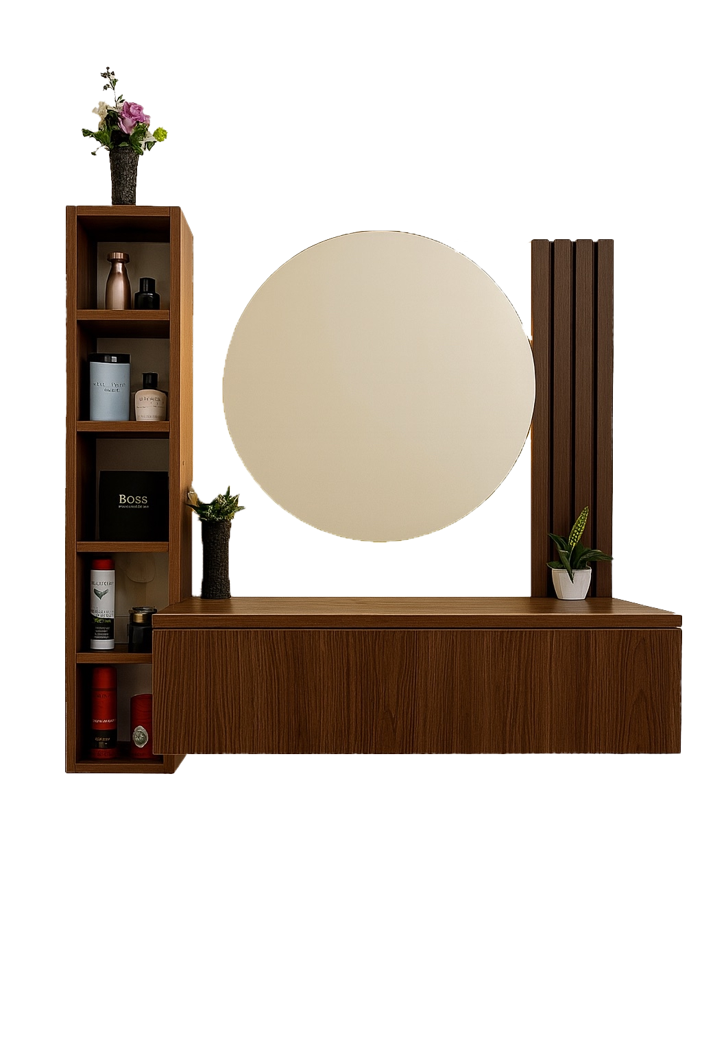 طاولة الزينة مزودة بمرآة دائرية مع إضاءة LED مدمجة تمنحك إضاءة واضحة ومتوازنة أثناء المكياج أو العناية بالبشرة.